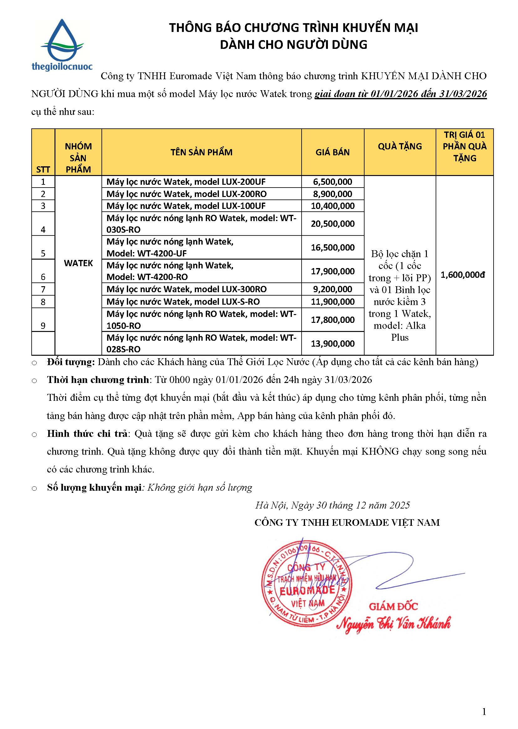 Chương trình khuyến mãiCTKM MUA MÁY LỌC NƯỚC WATEK TẶNG BÌNH TẠO KIỀM ALKA-PLUS 1.1-31.3.2026 Đã đăng trên 31 Tháng 12, 2025 bởi Thế Giới Lọc Nước Thế Giới Lọc Nước CTKM MUA MÁY PI TẶNG MÁY NÓNG LẠNH WT-028S-RO 1.1-31.3.2026 CTKM MUA MÁY LỌC NƯỚC WATEK TẶNG BỘ LỌC ECOM8000 1.1-31.3.2026