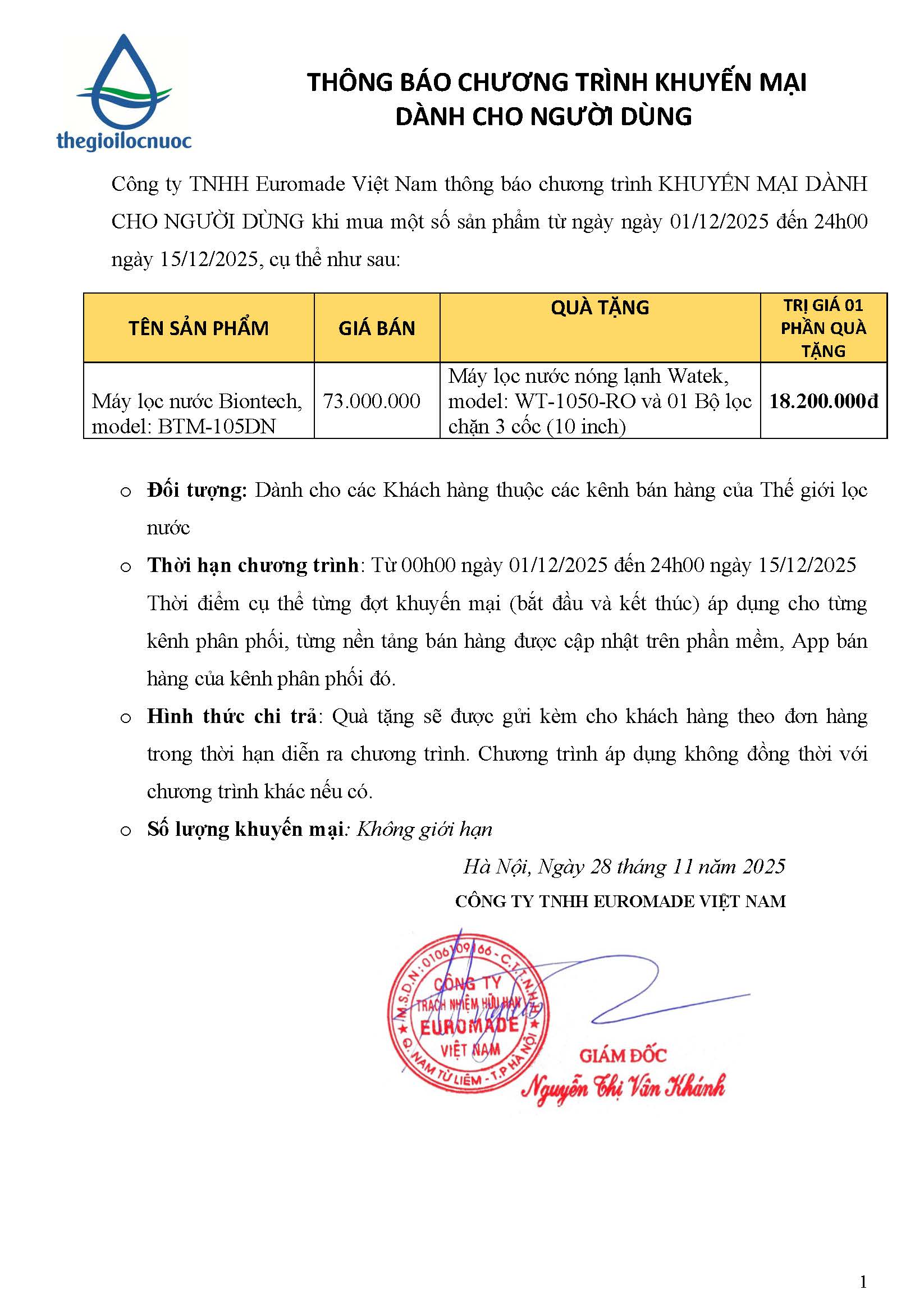 Chương trình khuyến mãiCTKM MUA MÁY PI BTM-105DN tặng máy nóng lạnh WT-1050-RO 01-15.12.2025 Đã đăng trên 1 Tháng 12, 2025 bởi Thế Giới Lọc Nước Thế Giới Lọc Nước CTKM BÌNH TẠO KIỀM MUA 3 TẶNG 1 & CTKM MÁY PI BTM-105DN TẶNG MÁY TẠO HYDROGEN ĐỂ BÀN 23 – 30.11.2025 CTKM MUA MÁY PI BTM-105DN TẶNG MÁY NÓNG LẠNH WT-4200-RO 01-31.12.2025